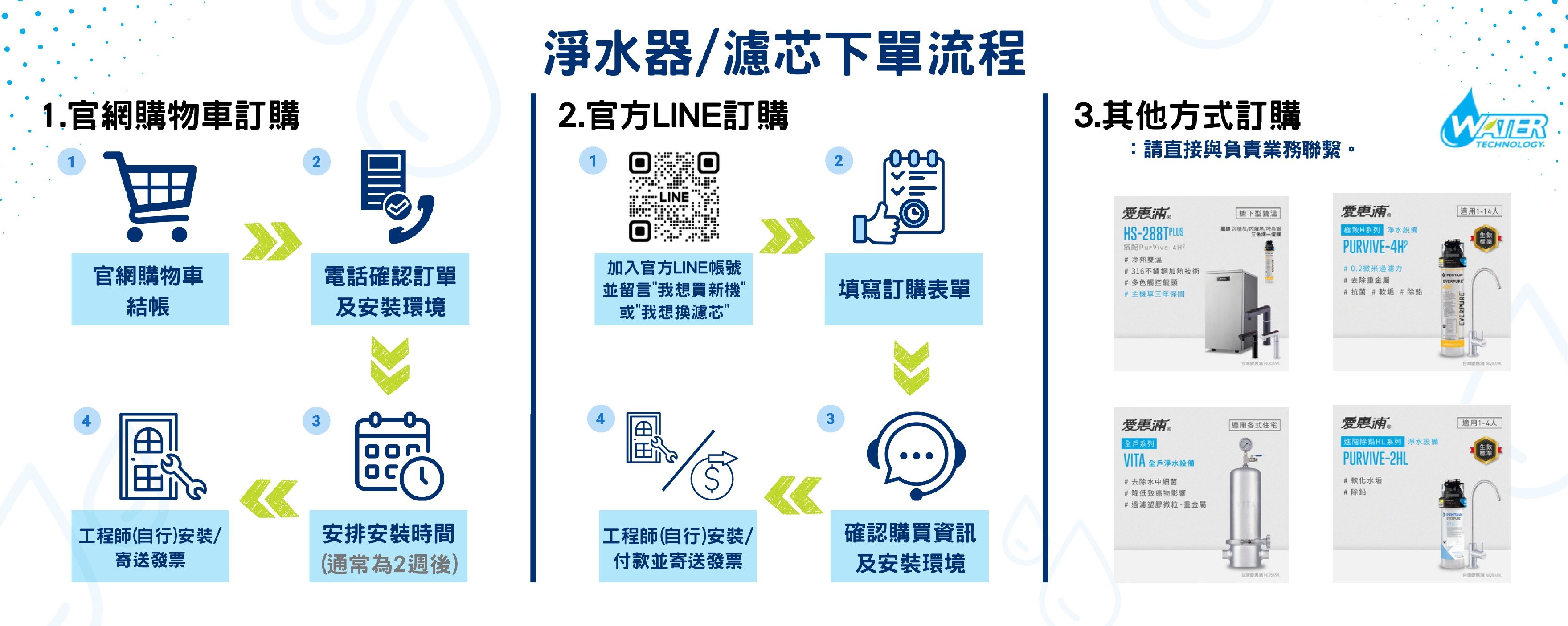 提升給水的品質,已經是現代生活的基本需求,利用優質的家用或商用淨水器可以給予飲用、沐浴盥洗或餐點飲品食品製作最佳的淨水,讓建築設施、健康與食安都能夠得到最大的保障。