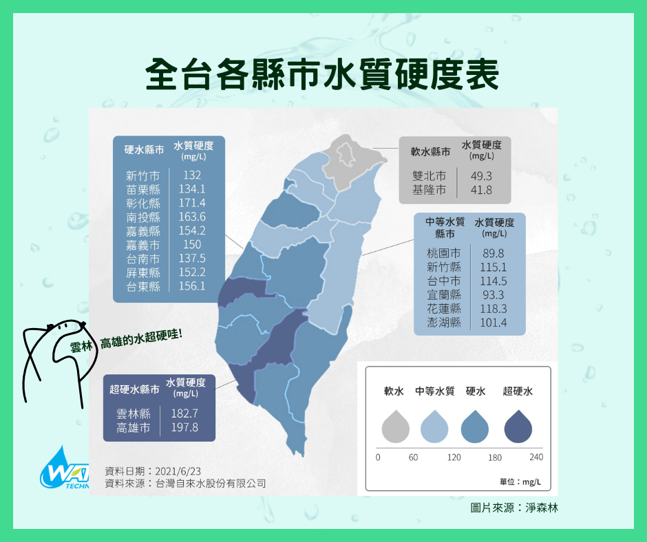 不難發現台灣從北到南,水質從軟到硬逐漸攀升