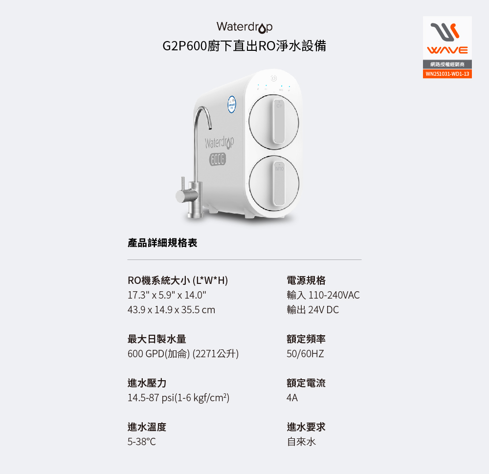 【愛惠浦】廚下型 WaterDrop G2P600 直出RO淨水設備